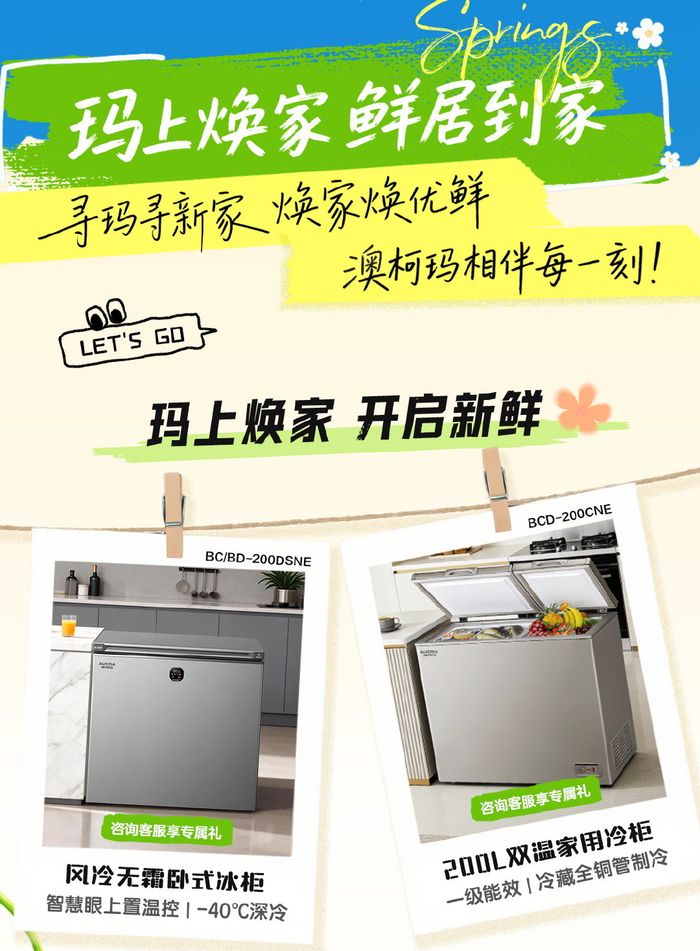 作为全冷链创领者,澳柯玛始终深耕储鲜领域,以科技创新迭代产品,以品质服务守护用户生活。本次“一玛当鲜,焕家优鲜”活动,不仅是产品的焕新,更是生活品质的升级。从硬核储鲜科技到诚意满满福利,澳柯玛致力于让每一个家庭都能轻松拥有新鲜、便捷、舒适的居家生活,新鲜生活即刻开启。快来参与澳柯玛电商促销活动,寻玛寻新家,焕家焕优鲜,用硬核储鲜好物,解锁春日鲜居新生活!